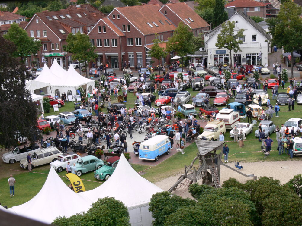 Treffpunkt war der Rasteder Marktplatz, wo ab 9.00 Uhr 44 Fahrzeuge mit 88 begeisterten Teilnehmern einrollten. Bevor es auf die Strecke ging, nahmen alle im Restaurant Santa Lucia ein stärkendes Frühstück ein, danach bekamen die Teams ihre Unterlagen – das Bordbuch und das Rennschild – überreicht, die für das kommende Abenteuer unerlässlich waren.